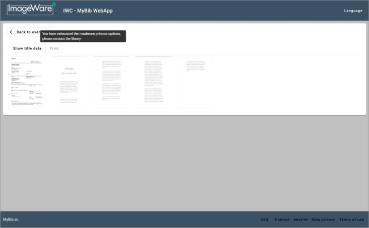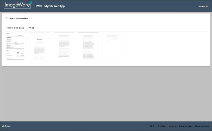 In the document view you can check the document’s title data or click on the flyleaf’s thumbnail (the first page in the document) to increase the image size. There you can view the order’s details. All other pages are pixelated, they will be legible when printed.