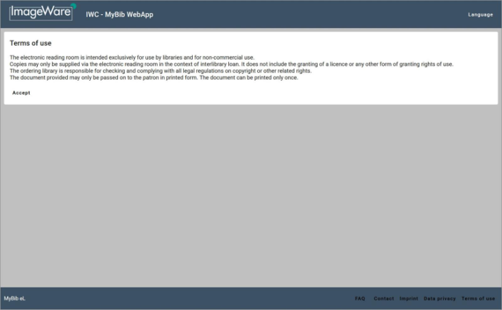 After you successfully logged in, the terms of use are displayed. Please read and confirm them by clicking on the “Accept” button.