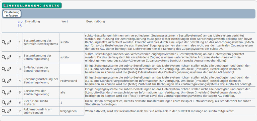 | Servicelevel der Zentralregulierung | alle | Einige Zugangssysteme die subito-Bestellungen an das Liefersystem richten stellen nicht alle benötigten und durch den ILL-subito-Standard vorgeschriebenen Informationen zur Verfügung. Um diese (invaliden) Bestellungen dennoch bearbeiten zu können wird der (feste) Service-Level des Zentralregulierungssystems der subito AG benötigt. |