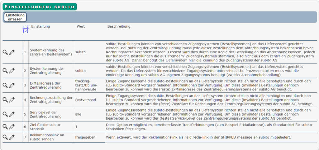 | E-Mailadresse der Zentralregulierung | tracking-test@tib.uni-hannover.de | Einige Zugangssysteme die subito-Bestellungen an das Liefersystem richten stellen nicht alle benötigten und durch den ILL-subito-Standard vorgeschriebenen Informationen zur Verfügung. Um diese (invaliden) Bestellungen dennoch bearbeiten zu können wird die (feste) E-Mailadresse des Zentralregulierungssystems der subito AG benötigt. |