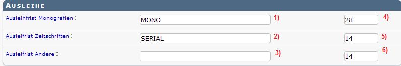 Zusätzlich befüllen Sie die Ausleihfrist in Tagen für Monografien, Zeitschriften und Andere zu jedem der Parameter (4 bis 6).