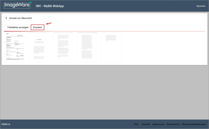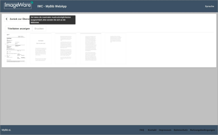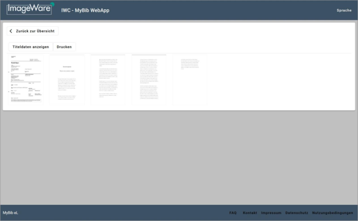 Nun erscheint eine Ansicht des Dokumentes, in der Titeldaten, ein Druckbutton und Thumbnails des Dokumentes angezeigt werden.