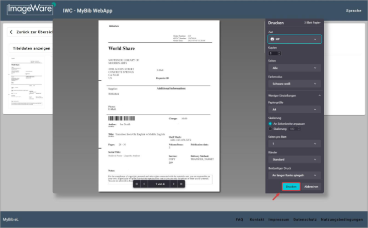 Bitte achten Sie darauf, dass Ihr Drucker funktionsfähig angeschlossen ist und genügend Tinte/Toner und Papier enthält. Da der Druck nicht unbegrenzt oft möglich ist, ist der Drucken Button neben den Titeldaten nach erfolgtem Druck ausgegraut und deaktiviert. Ein Popup-Text weist Sie ebenfalls darauf hin.