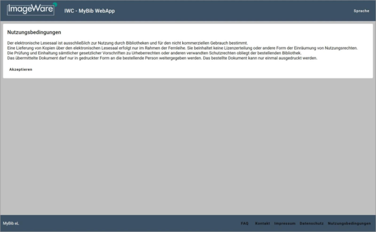 Nach erfolgreicher Anmeldung erscheinen die Nutzungsbedingungen. Lesen Sie diese bitte und bestätigen sie durch Klick auf “Akzeptieren”.